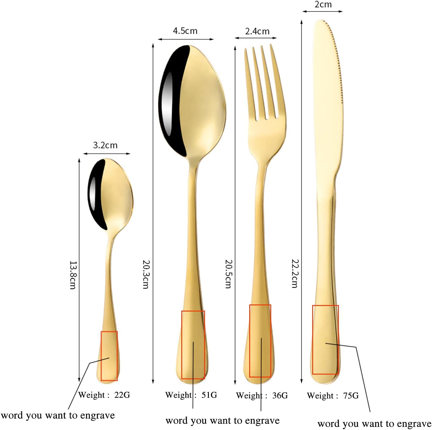 Personalization: You can enter a name or a sentence to create a unique gift for important people. By adding this text on it, you can create an exclusive gift of tableware for your family and friends, making them remember every moment.Material: The tableware is made of 304 stainless steel, engraved by laser, does not contain any harmful metal substances, anti-rust, easy to clean, and can be used in the dishwasher. With thick texture, it is the best choice for gift or personal use.Color: gold and silver are optional. Great for home daily use, entertainment, hotels, restaurants, parties, weddings and more.Contains: a set of cutlery (fork, knife, spoon, spoon), packed in a gift box, including a greeting card.Uses: Customizable tableware, text or patterns can be engraved anywhere on the tableware. It can be used to distinguish the belonging of the tableware, or to customize a memorable gift for your friends and family. Gifts for birthdays, anniversaries, Valentine's Day, Christmas, graduations and more.